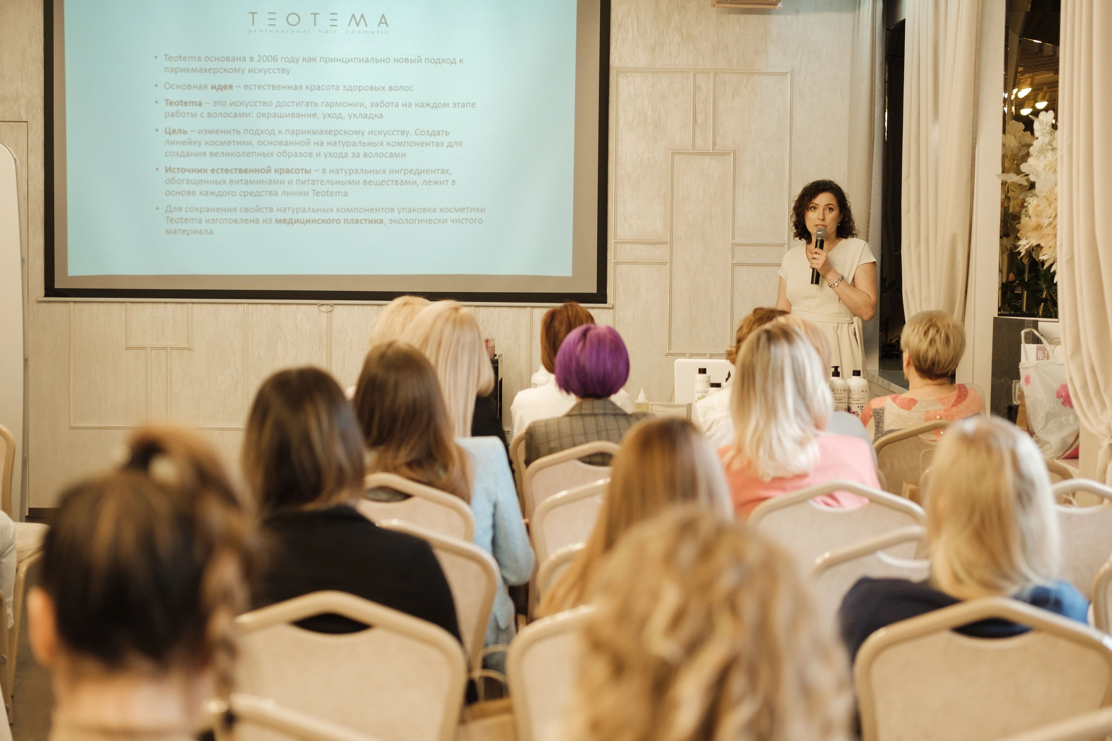 Прошедшей весной познакомиться с ассортиментом и преимуществами косметики марки Teotema смогли руководители и мастера салонов красоты из Перми. Презентацию бренда провела тренер и спикер бьюти-завтрака Лия Денисенко.